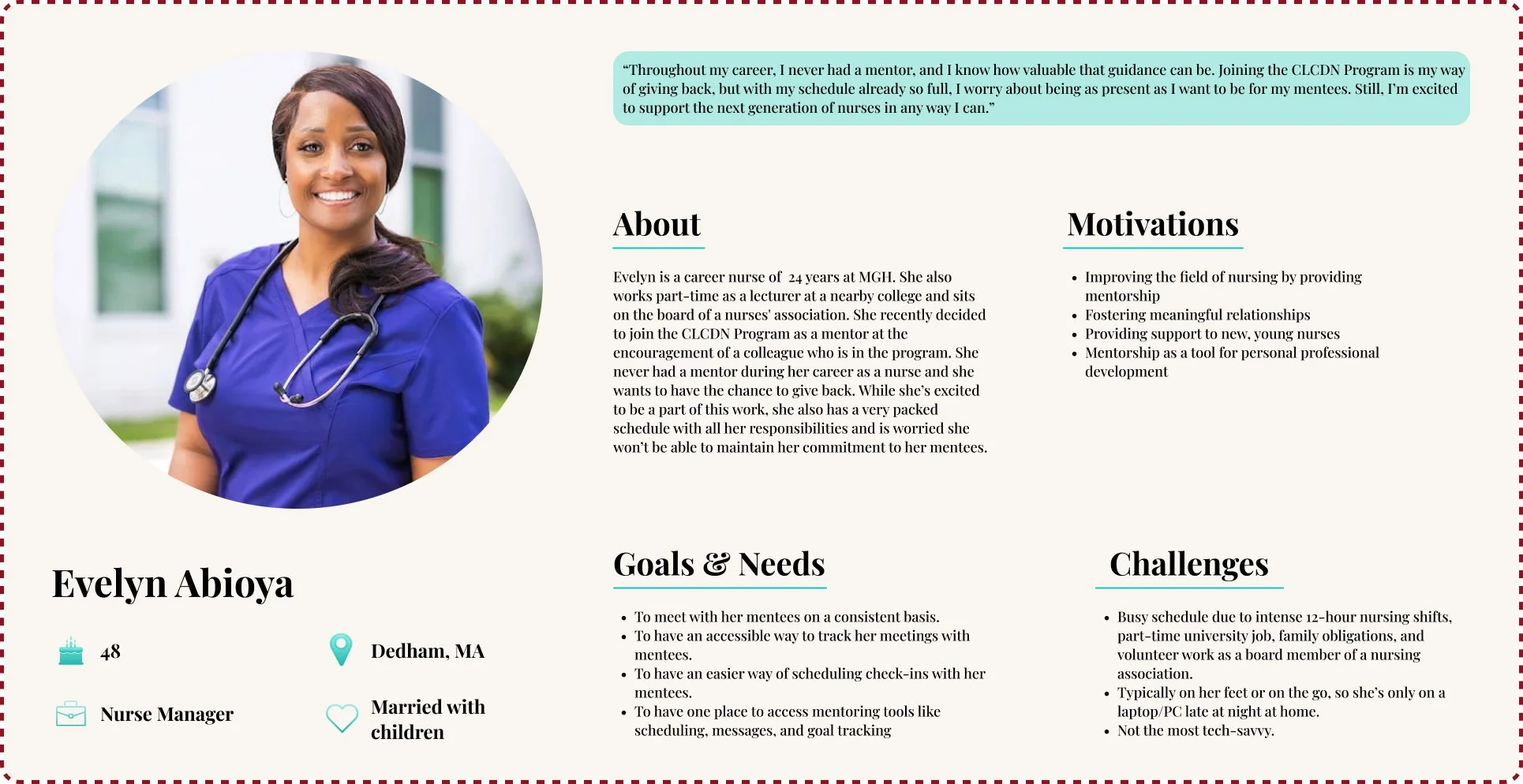 To better understand their challenges as busy nursing professionals with demanding priorities, I conducted user interviews with both mentors and mentees. I also spoke with program team members, since the platform’s data would be critical for funder reporting. What became clear is that while a platform could be highly valuable, a poor user experience would only hinder relationship-building and reduce its effectiveness.