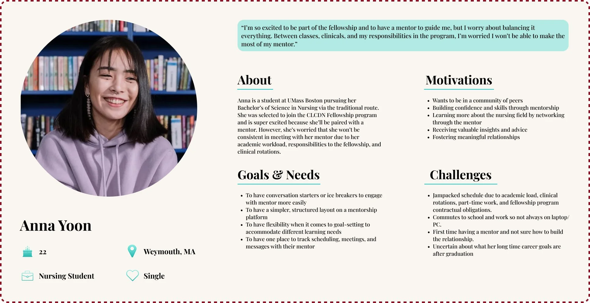 To tackle this challenge, I started by focusing on the people at the heart of the program—nurse mentors balancing demanding shifts and student fellows juggling school, work, and family. I wanted to understand what truly helps them stay connected, what makes their mentoring relationships meaningful, and how a platform could fit seamlessly into their daily lives.